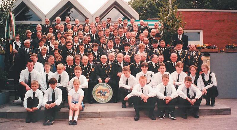 vordere Reihe v.l.n.r. : Claus Freesen (Kassenwart), Hinrich Buthmann (Vorsitzender des Schützenvereins), Karl-Heinz Intemann (amtierender König), Heinz-Georg Otterstedt (stellv. Schießwart)