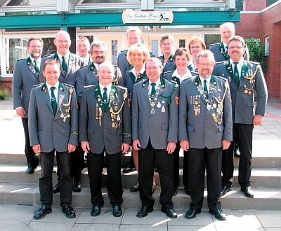hintere Reihe n.l.n.r.: Günter Köster (Festauschussvorsitzender), Hermann Kropp (stellv. Kommandeur), Kai Hartmann, (stellv. Kassenwart), Anja Kropp (stellv. Schriftwart), Sabine Rechten (stellv. Damenleiterin) und Heinz Sackmann (Jugendwart)
