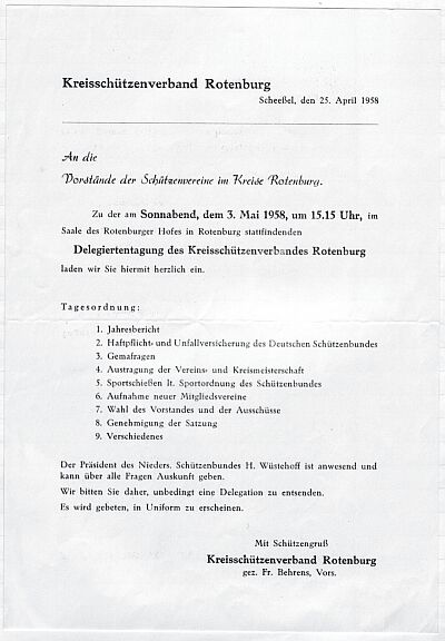 Mit Schreiben vom 25.04.1958 wurden alle Vereine des Landkreises Rotenburg eingeladen an der 1. Delegiertentagung des Kreisschützenverbandes Rotenburg teilzunehmen. Diese sollte am Sonnabend, den 03. Mai 1958 im Saal des Rotenburger Hofes in Rotenburg stattfi nden. Zu diesem Zeitpunkt hatten bereits 18 Schützenvereine mit insgesamt 1500 Mitgliedern ihren Beitritt zum Verband erklärt. Der Präsident des Schützenverbandes Niedersachsen, Hermann Wüstehoff, der als Gast erschienen war, übernahm den Tagungsvorsitz und führte die Wahl des Kreisvorstandes durch. Die Delegierten wählten dann einstimmig folgenden Kreisvorstand: