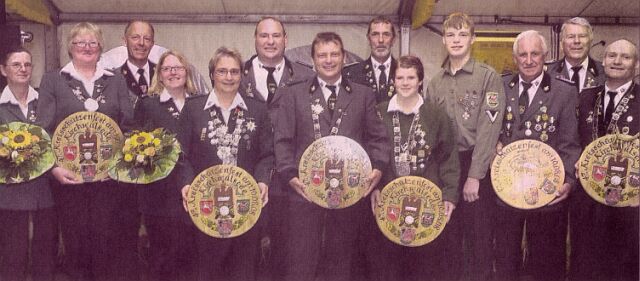 So krönte am Sonntagabend im gut gefüllten Kirchwalseder Festzelt der Kreischützenverbandspräsident Helmut Bellmann den Jeddinger Olaf Grünhagen zum neuen Kreisschützenverbandskönig. Gerd Bode, ebenfalls aus Jeddingen, wurde "Vize". Zuvor hatte Bellmann die beiden Jeddinger Schützenbrüder nach vorne gebeten. In dem Moment wusste den Jeddinger Schützen, der neue Kreismonarch kommt aus ihren Reihen. Damit begannen sie schon fröhlich zu feiern. Und als Bellmann dann Grünhagen zum neuen Kreiskönig ausrief, war die Freude bei den Jeddingern natürlich groß. Für Grünhagen ist es sein erster Königstitel überhaupt. Denn der 38-jährige Familienvater einer Tochter und eines Sohnes hatte bislang noch keinen Titel erringen können. Eva Lühning, die Tochter des ersten Vorsitzenden des gastgebenden Schützenvereins Kirchwalsede, Gerhard Lühning, wurde Vize-Kreiskönigin. Der neue Kreisalterskönig stammt aus dem Schützenverein Hassendorf, dem Ausrichter des nächsten Kreisschützenfestes, heißt Hinrich Buthmann und ist Hassendorfer Schützenchef. Vize-Kreisalterskönig wurde Peter Thiede aus Ahausen. Neue Kreisalterskönigin ist Heike Johannmeyer (Kettenburg), neue Vize-Alterskönigin Edelgard Jäger (Wittorf). Die neue Kreisjugendkönigin heißt Nadine Lorke (Hiddingen), der neue Vize-Jugendkönig ist Bernd Böhling aus Kirchwalsede. Die Ehrenscheibe ging an Ewald Sültenfuß (Wittorf). Somit gingen die meisten Titel an den Schützenbund.