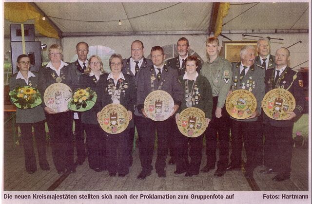 Nach einem kurzen Rundmarsch durch den prächtig geschmückten Ort begannen auf den Ständen die Wettbewerbe um die Titel der Kreismajestäten. Und es sollte ein Tag ganz nach dem Geschmack des Schützenbundes Visselhövede werden: Vier der fünf Königstitel, dazu zwei Vize-Orden und die Ehrenscheibe gingen an Mitglieder von vier Vereinen des Kirchspiels. Den Kreiskönigstitel sicherte sich Olaf Grünhagen (Jeddingen, 30 Ring/Teiler 567,8) vor seinem Vereinskollegen Gerd Bode (29/593,2). Neue Kreiskönigin ist Iris Fedderke aus Hiddingen (30/443,4) vor Eva Lühning vom gastgebenden Verein Kirchwalsede (29/664,2). Die Scheibe des Alterskönigs sicherte sich Hinrich Buthmann aus Hassendorf (30/316,9) vor Peter Thiede aus Ahausen (29/506,7). Als Alterskönigin wurde Heike Johannmeyer aus Kettenburg (30/456,2) vor Edelgard Jäger (28/650,8) proklamiert. Bei den Jugendlichen siegte Nadine Lorke aus Hiddingen (28/730,2) vor Bernd Böhling aus Kirchwalsede (28/828,8). Die Ehrenscheibe ging an Ewald Sültenfuß vom Schützenverein Wittorf (30/548,1).