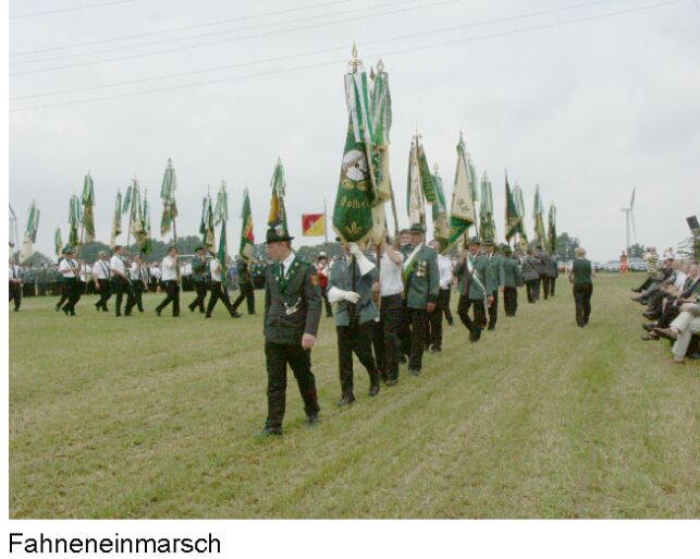 Hiernach folgten das gemeinsame Spiel der Spielleute und die Nationalhymne, gespielt vom Musikzug Bothel. Anschließend übernahm der Kommandeur des SV Hassendorf das Kommando und führte die Schützen, begleitet von heftigen Böllerschüssen, zu einem gemeinsamen Rundmarsch durch das prachtvoll geschmückte Hassendorf.